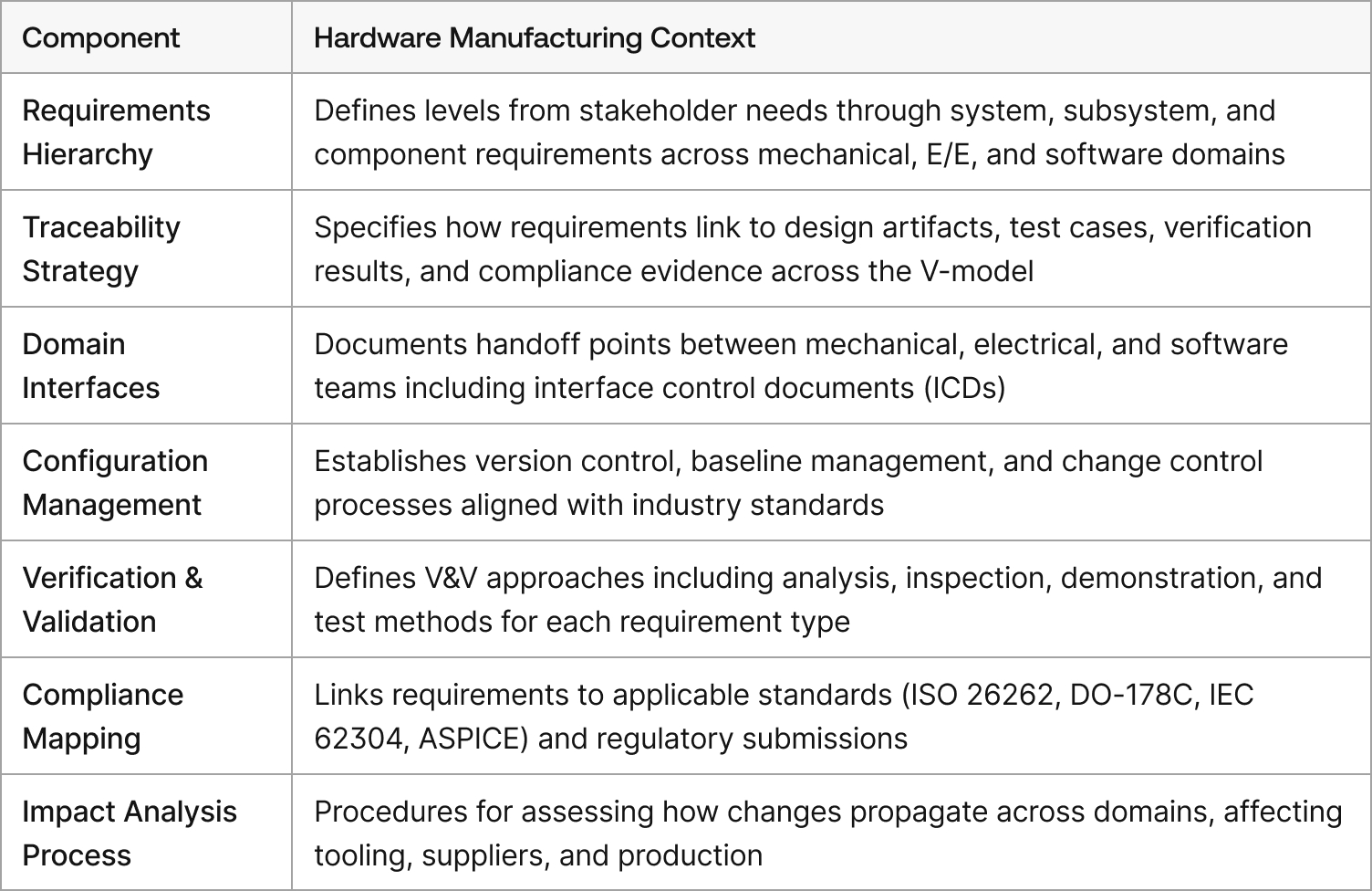 A Requirements Management Plan (RMP) defines how your organization will handle requirements throughout the product development lifecycle. In hardware manufacturing, this plan must account for the multi-domain nature of mechatronic development and the rigorous traceability demanded by industry standards and regulations.