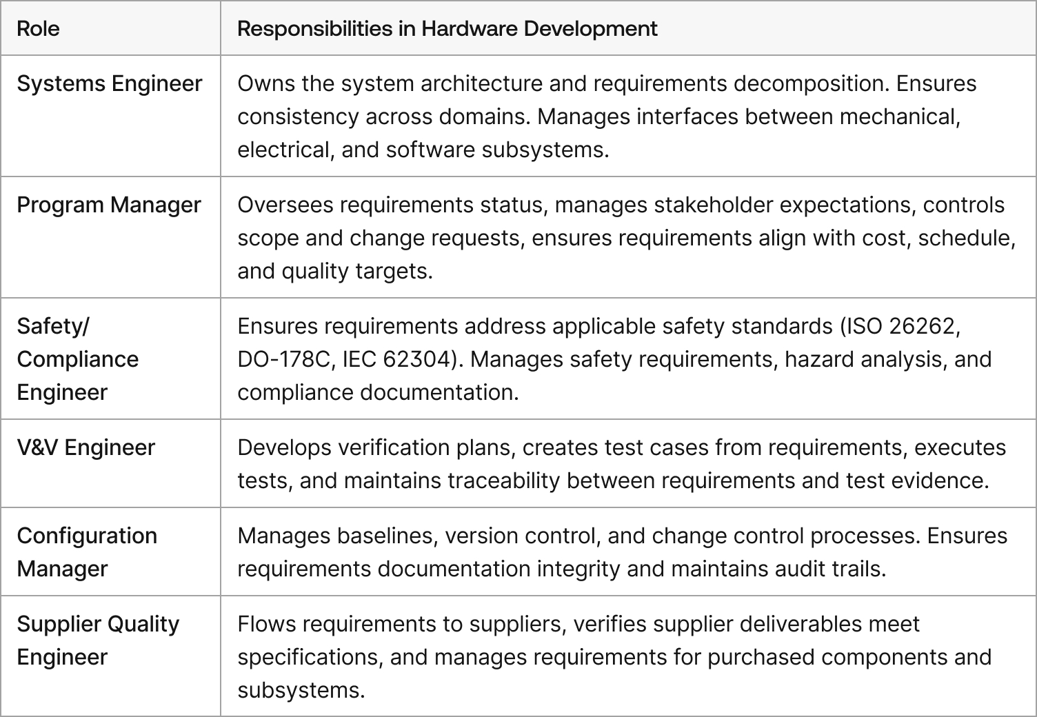 Hardware requirements management demands coordination across more specialized roles. The multi-domain nature of mechatronic products means that no single person can hold all the requirements in their head.