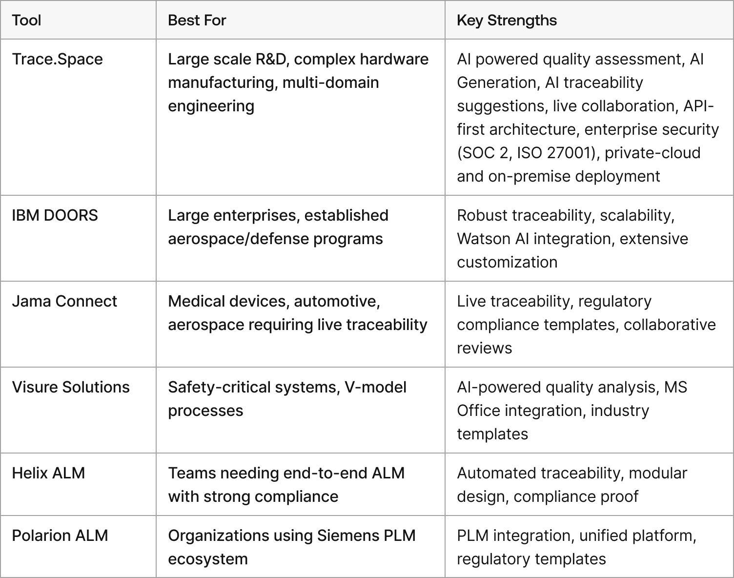 Each tool approaches these capabilities differently; Trace.Space aims to address them through a modern architecture suited to organizations scaling multi-domain engineering.
